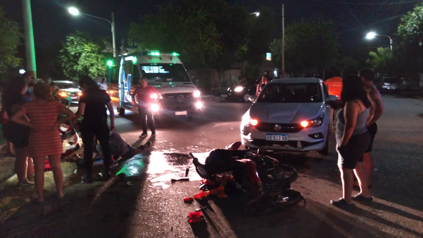 Durante la noche de ayer, en el interior del Barrio Andacollo I, sobre calles Rivadavia y Yapeyu, de Chimbas, se produjo un violento accidente de tránsito entre una moto marca Konisa 110cc y un auto Fiat Cronos, que dejó al hombre que se trasladaba en el rodado menor inconsciente y con heridas de consideración.