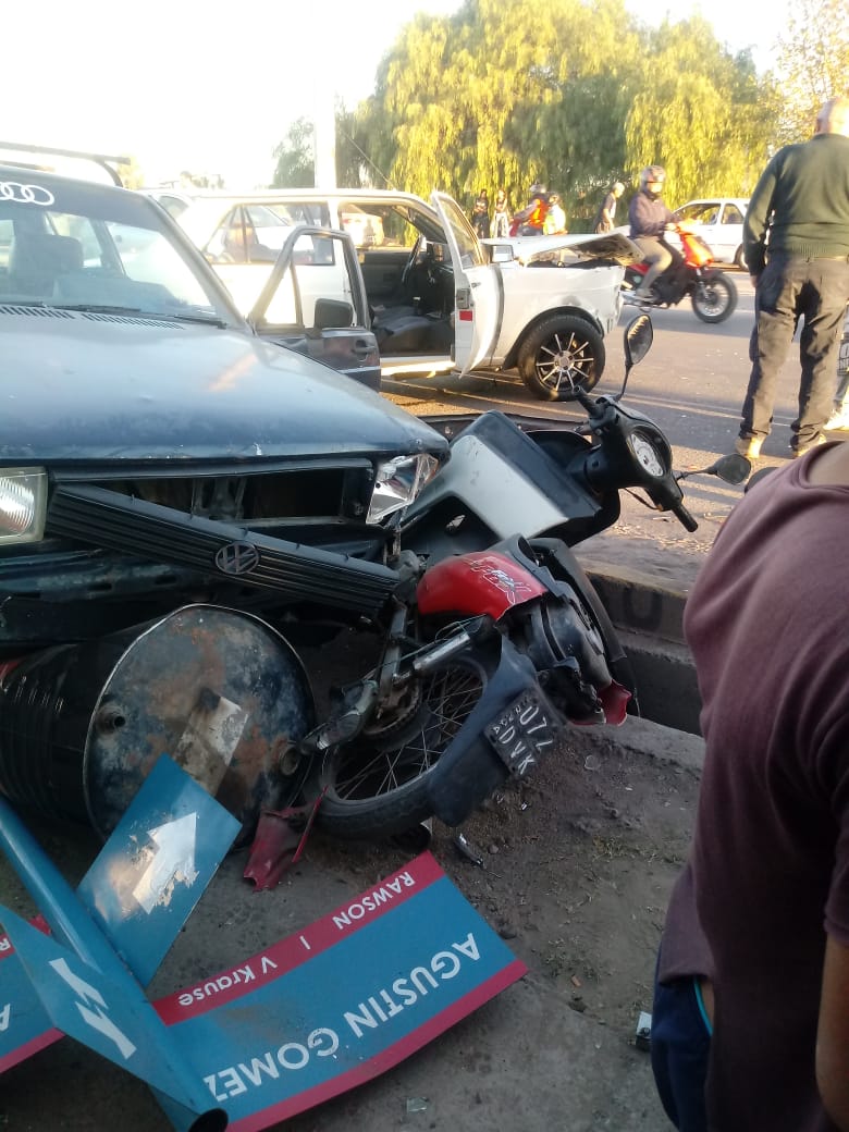 Según las primeras informaciones el siniestro vial se produjo, por causas que aún se desconocen, entre un Volkswagen Gacel, un Fiat 128 y una moto Scooter. Producto del fuerte choque, la moto quedó incrustada en el frente del Gacel y además derribaron un cartel señalizador de calles.