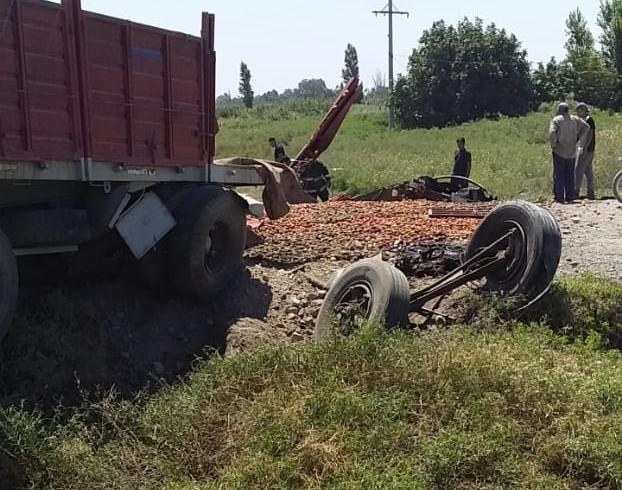 Según informaron testigos, el siniestro vial se produjo pasadas las 12. Aparentemente un viejo camión sufrió la rotura de un neumático, posteriormente se desarmó al perder el eje delantero y, como si fuera poco, toda la carga de tomates que transportaba quedó en el suelo.