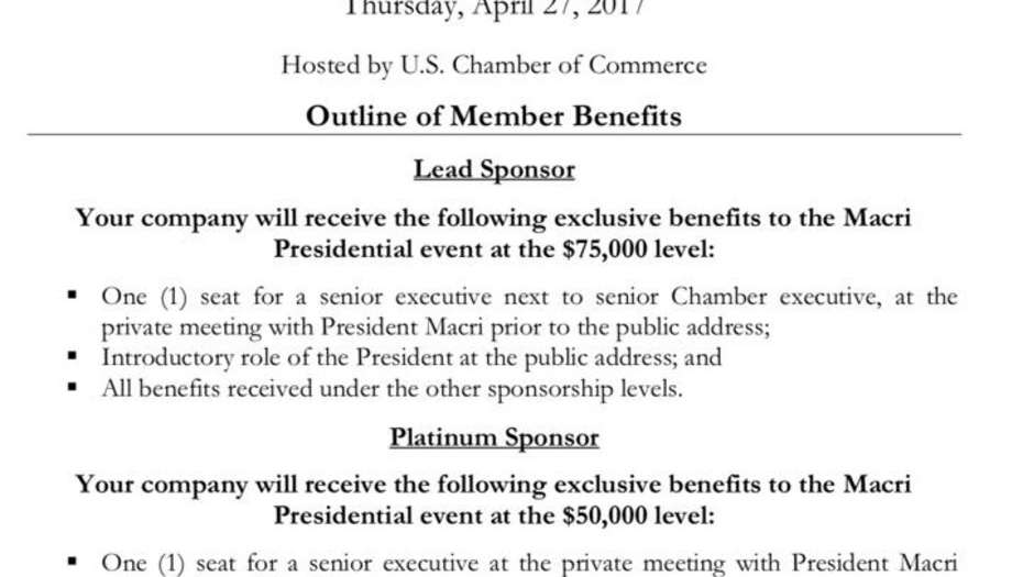 Según pudo saber Clarín de fuentes en Washington, el llamado “paquete de sponsoreo” que hizo circular la Cámara de Comercio a su cartera de empresas que quieran estar en privado con “su excelencia Mauricio Macri, presidente de la República Argentina”, hay tres posiblidades.