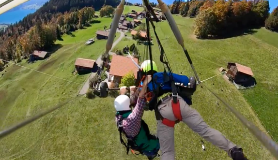 Un turista estadounidense de visita en Suiza se arriesgó a lanzarse por primera vez en ala delta, y tuvo que volar sujetándose con las manos porque al piloto se le olvidó enganchar su arnés al aparato.