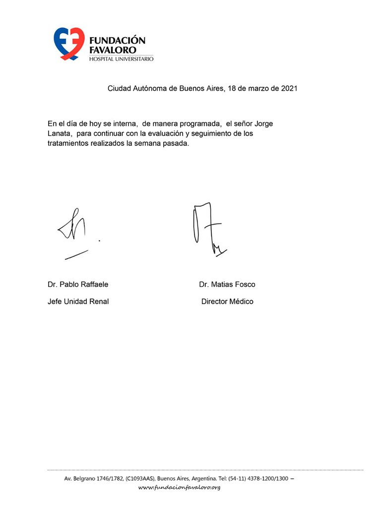 La Fundación Favaloro informó este jueves que Jorge Lanata fue ingresado nuevamente a la institución médica. “En el día de hoy se interna, de manera programada, el señor Jorge Lanata para continuar con la evaluación y seguimiento de los tratamientos realizados la semana pasada”, reza el comunicado. El pasado 9 de marzo había sido dado de alta tras ser diagnosticado con una arritmia cardíaca y una trombosis en su pierna izquierda.
