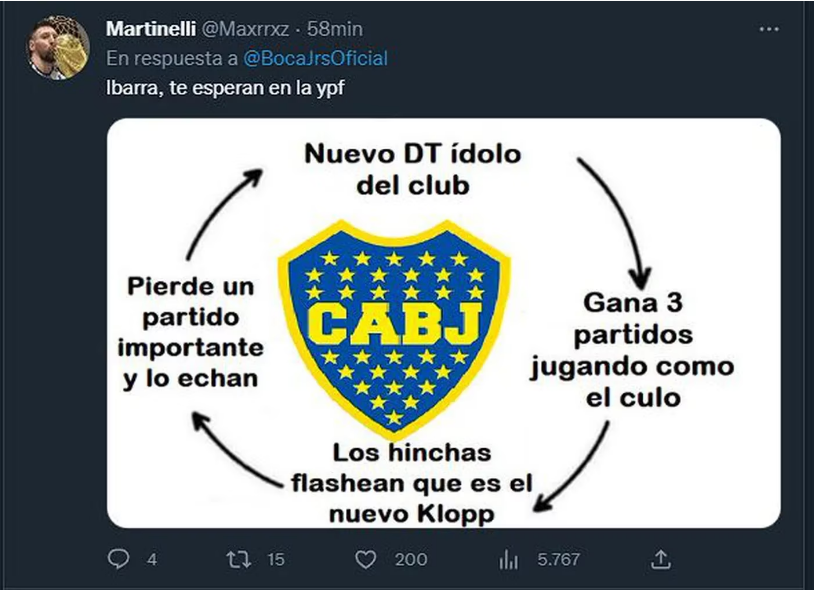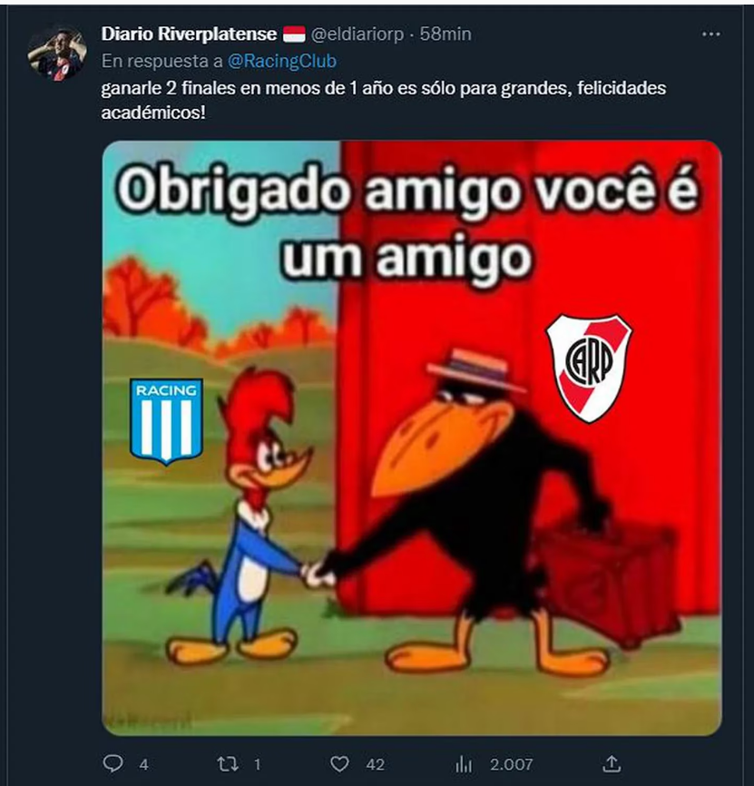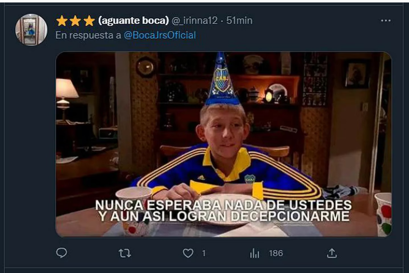Entre tanto malestar de los hinchas de Boca, también hubo lugar para los memes, de un lado y del otro. Hinchas de todos los equipos tomaron partido ante la situación: muchos se burlaron de la derrota del Xeneize y otros salieron al cruce de Racing, por el penal que le dieron sobre la hora.