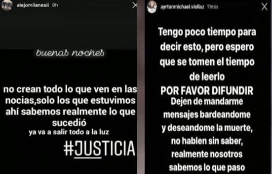 “No crean todo lo que ven en las noticias, solo los que estuvimos ahí sabemos lo que realmente pasó”, es uno de los textos que apareció en el Instagram de Alejo Milanesi, uno de los detenidos. En ese caso, fue su novia la que se apropió de la cuenta para hacer las polémicas declaraciones: “No hagan caso a lo que dicen las redes, él es inocente”.