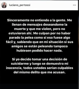 “Sinceramente no entiendo a la gente, me llenan de mensajes deseándome la muerte y que me violen, pero no estuvieron ahí. Me culpan por no haber parado la pelea como si eso fuese algo fácil”, dice otra de las publicaciones hablando en primera persona.