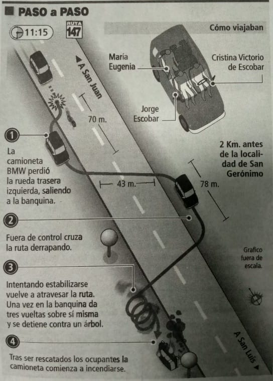 En cuestión de minutos el vehículo quedó envuelto en llamas. El fuego redujo el rodado a chatarra, tanto así que los efectivos policiales que trabajaron en el lugar no pudieron ni siquiera reconocer la patente. Escobar, Cristina Raquel Victorio y su hija María Eugenia fueron rescatados antes de que el fuego los alcanzara.