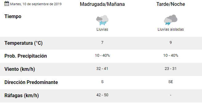 El Servicio Meteorológico Nacional anuncia lluvias para este próximo martes 10 de septiembre y muy bajas temperaturas.