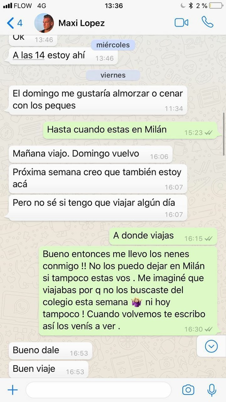 En el intercambio de mensajes por WhatsApp se puede leer que Maxi le pide ver a sus hijos el domingo por el Día del padre y ella le pregunta hasta cuándo estará de viaje. "El domingo vuelvo. Próxima semana creo que también estoy acá (por Milán, donde vive Wanda), pero no sé si tengo que viajar algún día", le contesta él.