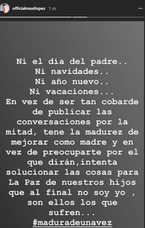 Entonces, para sorpresa de todos, lejos de mostrarse enojado o decepcionado por la respuesta y la noticia de que no podría estar junto a sus hijos en el Día del padre, él le contesta: "Bueno, dale. Buen viaje". Algo muy diferente a lo que dos días después expresaría en su posteo en Instagram, donde se mostraría compungido por estar lejos de los chicos.