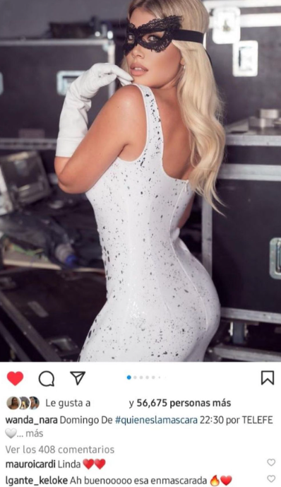En medio de todo este escándalo, Wanda Nara compartió en su perfil una osada foto en la que se la puede ver con un sofisticado vestido blanco con detalles de círculos espejados y posó con un antifaz en el rostro en la previa del big show de Telefe del domingo. Pero lo que más llamó la atención fue que tanto Icardi como L-Gante reaccionaron.