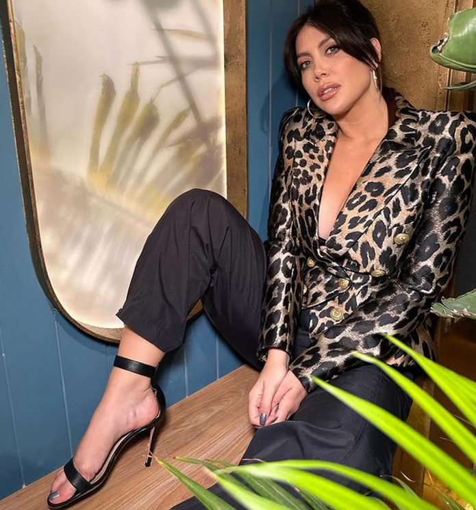 La empresaria posó en sus redes sociales con un look de alto impacto que dejó a sus seguidores con la boca abierta. Llevó un conjunto de saco estampado con diseño textil de leopardo en tonos marrones, escote XXL al extremo y doble abotonadura dorada; y pantalón tipo parachute en total black. Para el calzado, eligió unas sandalias altísimas negras con taco aguja, un diseño clásico y sencillo, ideal para llevar con las apuestas más elegantes.