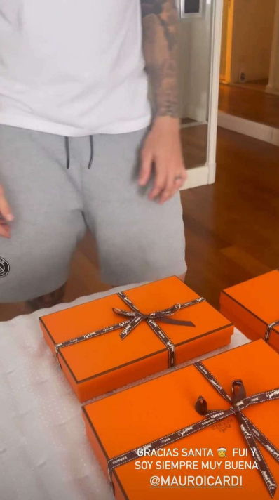 Durante Nochebuena, Mauro Icardi dejó varios regalos en el arbolito con el nombre de Wanda Nara, que luego del brindis de Navidad se acercó para saber qué eran. El futbolista la sorprendió con seis cajas de Hermès, su marca favorita.