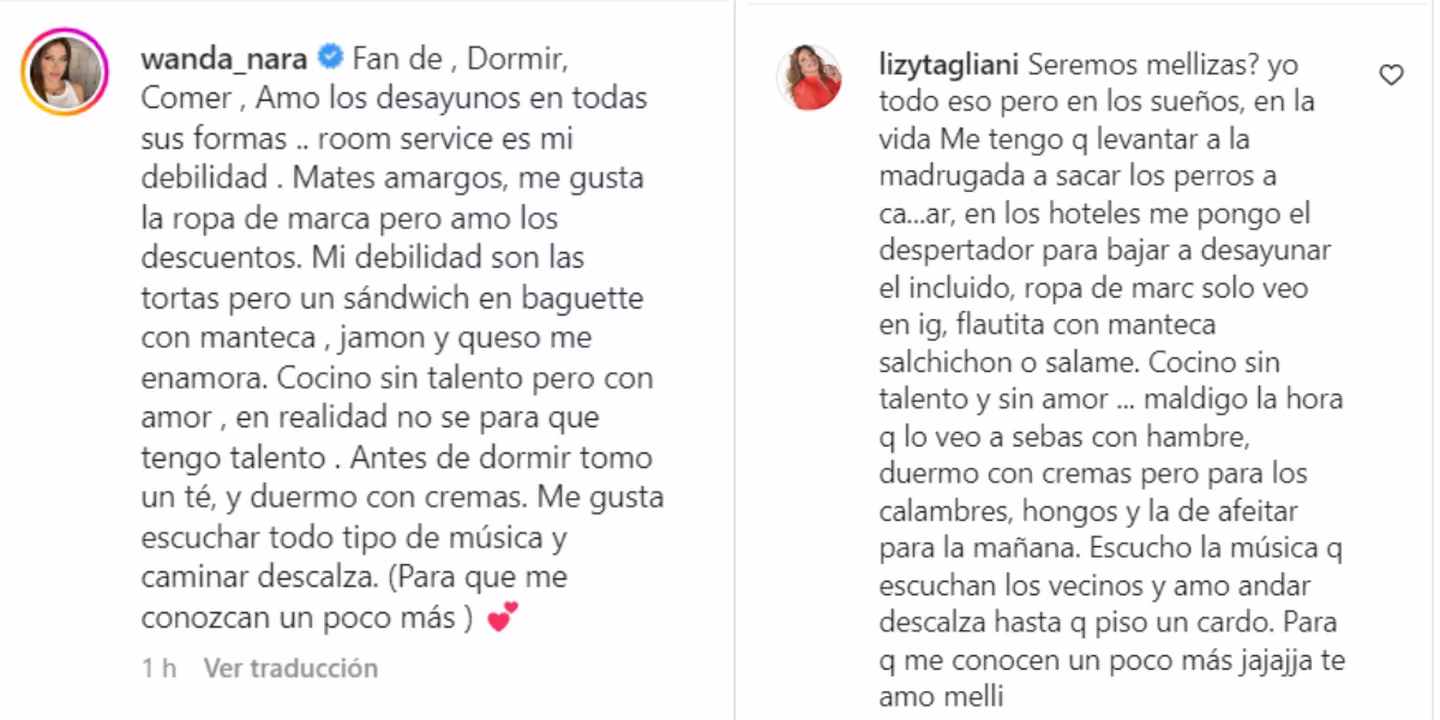 Desde su llegada a Argentina el pasado viernes, Wanda Nara se volvió el centro de atención en las redes sociales. Esta vez, la empresaria realizó un posteo en sus redes contando sus gustos y quehaceres, pero la respuesta de Lizy Tagliani a su publicación se llevó todas las miradas y risas.