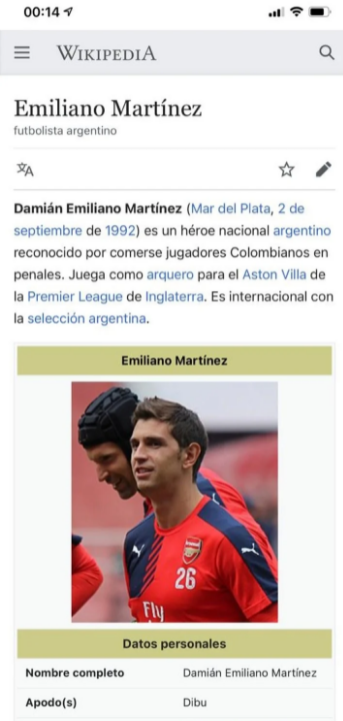 Emiliano Martínez se transformó anoche en "héroe nacional argentino", o al menos eso es lo que consideró la persona que modificó su perfil de Wikipedia apenas finalizado el encuentro en el que la Selección Argentina venció a Colombia desde los doce pasos para ser finalista de la Copa América.