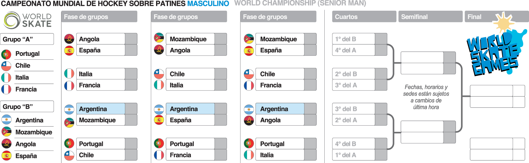 Apenas quedó conformado el grupo y quedó visualizado en pantalla gigante, el entrenador de la selección argentina masculina de hockey sobre patines, José Luis Paz, asintió conforme. Fue sólo un pequeño gesto para el afuera, aunque quizás su cabeza inmediatamente comenzó a trabajar lo que viene. Es que ayer se realizó el sorteo de los grupos del World Skate Games para el hockey sobre patines y al combinado albiceleste le tocó nada menos que España, pero también el azar determinó que en la Zona B estén Mozambique y Angola. La otra sección, en tanto, tiene otro panorama porque a Portugal, cabeza de grupo, le tocaron Francia, Italia y Chile. El sorteo se realizó anoche en el salón Eloy Camus del Centro Cívico, en una gala en la que además se hizo la presentación de la camiseta, la canción oficial y la mascota del Mundial, que se realizará desde el mes próximo.