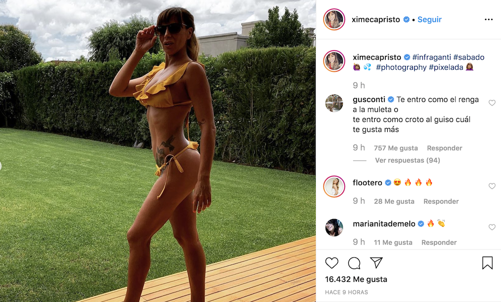 En las últimas horas, la modelo compartió una fotografía en su cuenta de Instagram donde se la ve de perfil luciendo una bikini de color amarillo en el fondo de su casa. Pese a que el posteo recibió cientos de comentarios, fue el de su esposo el que se destacó, ya que contaba con un contenido explosivo.