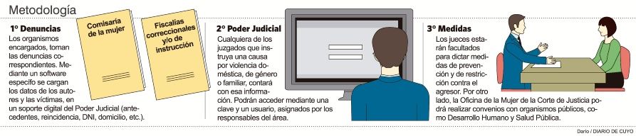 Los que realizan la carga serán los que justamente reciben las denuncias: las uniformadas de la Comisaría para la Mujer y el personal de las Fiscalías, principalmente las Correccionales . En el registro se dejará constancia de los datos del agresor y la víctima, el tipo de violencia ejercido (física, psicológica o verbal) y la periodicidad con que se ejerce. A medida que se vaya llenando el sistema con las causas actuales y las de años anteriores, saltará a la vista los datos del o los atacantes cuando una damnificada revele una nueva agresión.