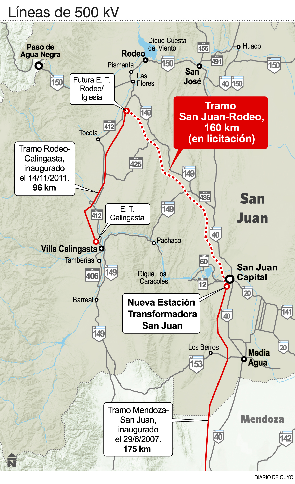 San Juan espera luz verde de la Nación para construir la línea de 500 kV Rodeo-La Rioja, y según lo anticipado ayer, la licitación puede ser pronto. Según dijo Osvaldo Rolando, subsecretario de Energía de la Nación, la obra ‘esta en carpeta del gobierno nacional’’ y anticipó que ‘en dos meses’ se lanzará licitación de obras de transporte para atender la futura demanda y las energías renovables. En San Juan ya tienen el proyecto listo y los pliegos de licitación aprobados por Transener para poder aprovechar inmediatamente cuando la Nación, que debe aportar el 50% del financiamiento, decida dar vía libre a la obra. ‘’Eso permitirá que San Juan y La Rioja tengan abastecimiento más seguro. Más adelante vendrá la conexión Calingasta-Gran Mendoza, para atender el futuro proyecto mendocino Cordón del Plata’’, explicó el titular del EPRE, Rivera Prudencio. Agregó que en la zona de Calingasta hay proyectos de energías no convencionales por 80 MW y además en la zona de Tocota se preparan proyectos por más de 600 MW para presentarse en la Segunda Ronda del Plan Renovar, por lo que hay que ir preparando cómo sacar la electricidad de esa zona.