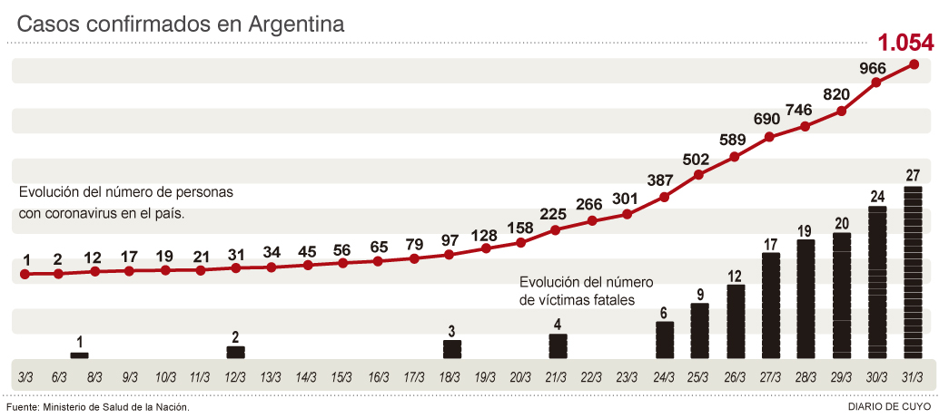 Tres personas fallecieron y 88 fueron diagnosticadas con coronavirus ayer en Argentina, con lo que ascienden a 27 las víctimas fatales y 1.054 los casos positivos, informó el Ministerio de Salud de la Nación en su reporte diario.