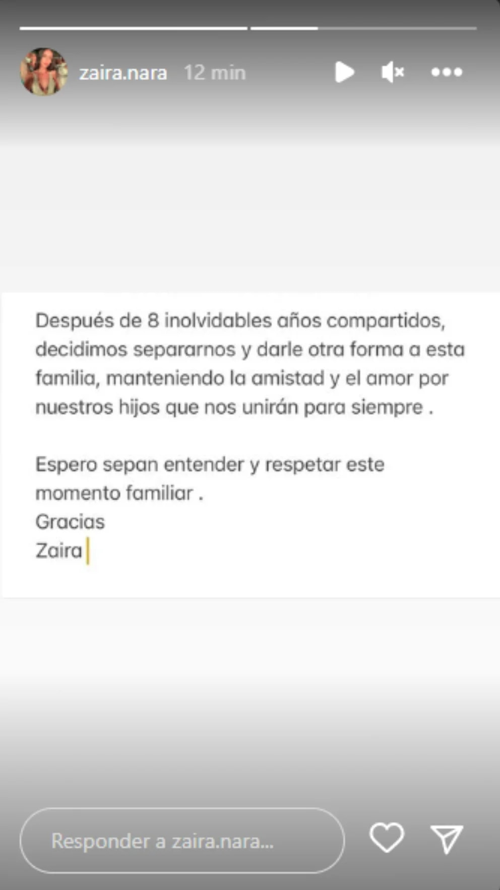 Luego agregó: "Espero sepan entender y respetar este momento familiar. Gracias, Zaira", concluyó.